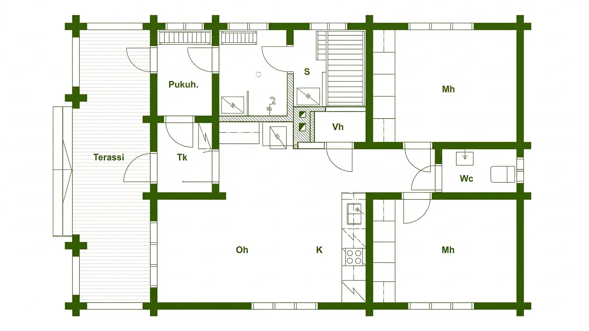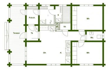 62 m2 yhdessä kerroksessa, tupakeittiö, Separett-WC, suihku, puulämmitteinen sauna