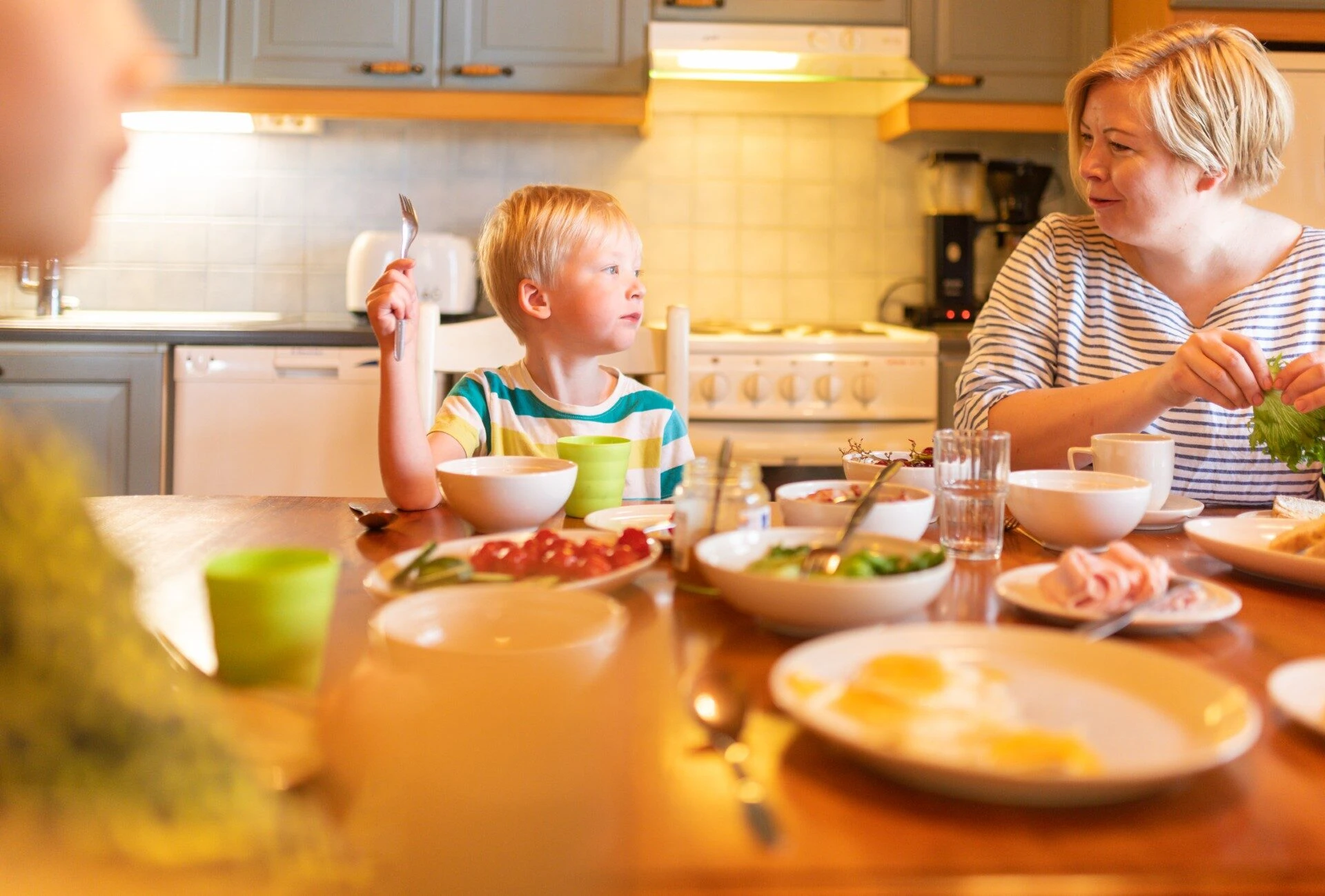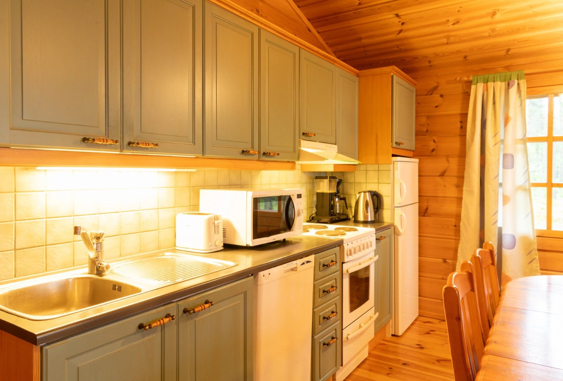 Jääkaappipakastin, sähköliesi, sähköuuni, mikroaaltouuni, leivänpaahdin, kahvinkeitin, komposti biojätteille